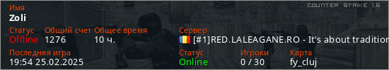 Играет на Counter Strike 1.6 сервере. Страна: РумынияПервый раз замечен 20:58 30.07.2022