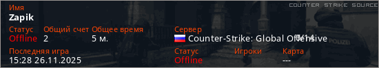 Играет на Counter Strike Source сервере. Страна: РоссияПервый раз замечен 15:13 26.11.2025