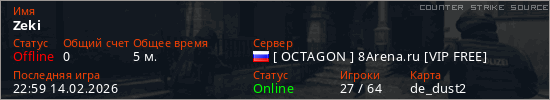 Играет на Counter Strike Source сервере. Страна: РоссияПервый раз замечен 22:55 14.02.2026