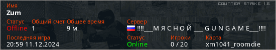 Играет на Counter Strike 1.6 сервере. Страна: РоссияПервый раз замечен 20:52 11.12.2024