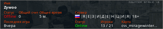 Последний раз был в сети 23 часа назад Игрок с таким ником замечен на 21 сервере