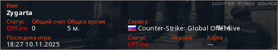 Играет на Counter Strike Source сервере. Страна: РоссияПервый раз замечен 18:24 10.11.2025
