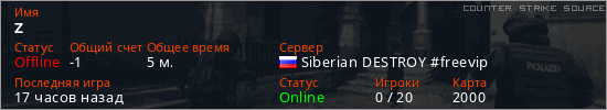 Играет на Counter Strike Source сервере. Страна: РоссияПервый раз замечен 20:02 22.01.2026
