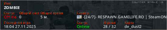 Играет на Counter Strike 1.6 сервере. Страна: СШАПервый раз замечен 18:02 27.11.2025