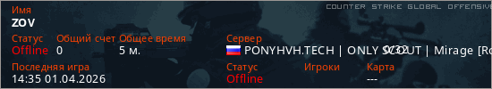 Играет на Counter Strike Global Offensive сервере. Страна: РоссияПервый раз замечен 14:29 01.04.2026