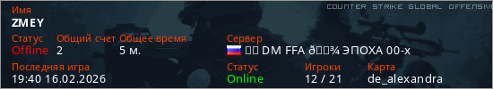 Играет на Counter Strike Global Offensive сервере. Страна: РоссияПервый раз замечен 19:36 16.02.2026