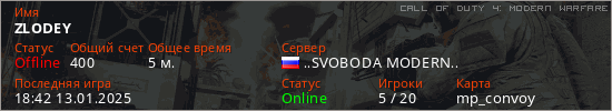 Играет на Call of Duty 4: Modern Warfare сервере. Страна: РоссияПервый раз замечен 18:40 13.01.2025