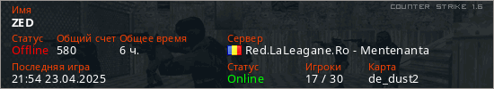 Играет на Counter Strike 1.6 сервере. Страна: РумынияПервый раз замечен 16:48 15.08.2022