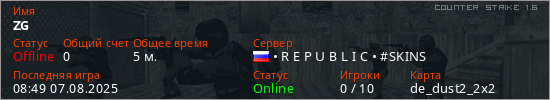 Играет на Counter Strike 1.6 сервере. Страна: РоссияПервый раз замечен 08:47 07.08.2025