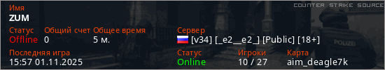 Играет на Counter Strike Source сервере. Страна: РоссияПервый раз замечен 15:42 01.11.2025