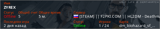 Играет на Half Life 2 DeathMatch сервере. Страна: РоссияПервый раз замечен 14:43 04.04.2026