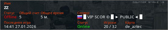 Играет на Counter Strike 1.6 сервере. Страна: РоссияПервый раз замечен 14:24 27.01.2026