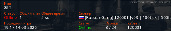 Играет на Counter Strike Source сервере. Страна: РоссияПервый раз замечен 18:15 14.03.2026