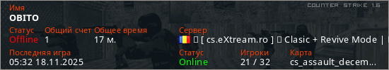 Играет на Counter Strike 1.6 сервере. Страна: РумынияПервый раз замечен 01:28 18.11.2025