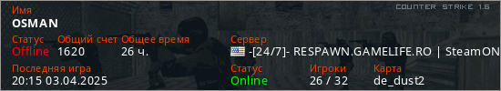 Играет на Counter Strike 1.6 сервере. Страна: СШАПервый раз замечен 20:29 09.02.2025
