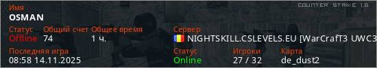 Играет на Counter Strike 1.6 сервере. Страна: РумынияПервый раз замечен 15:33 04.08.2025