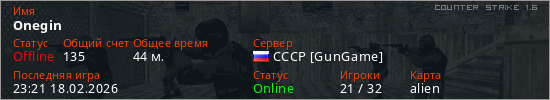 Играет на Counter Strike 1.6 сервере. Страна: РоссияПервый раз замечен 23:04 17.02.2026