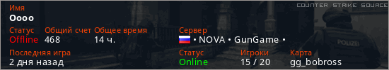 Играет на Counter Strike Source сервере. Страна: РоссияПервый раз замечен 21:22 15.03.2025