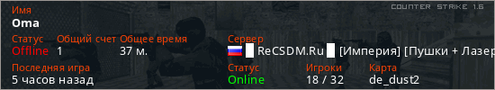 Играет на Counter Strike 1.6 сервере. Страна: РоссияПервый раз замечен 15:34 22.03.2026