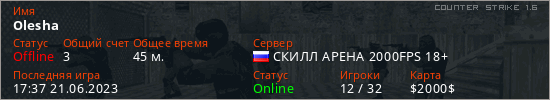 Играет на Counter Strike 1.6 сервере. Страна: РоссияПервый раз замечен 17:15 21.06.2023