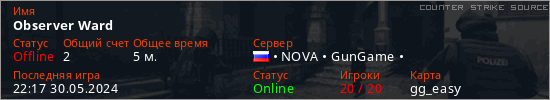 Играет на Counter Strike Source сервере. Страна: РоссияПервый раз замечен 21:17 30.05.2024
