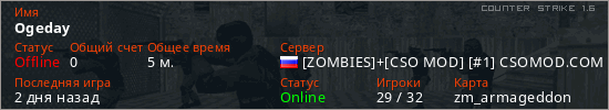 Играет на Counter Strike 1.6 сервере. Страна: РоссияПервый раз замечен 00:03 26.04.2026