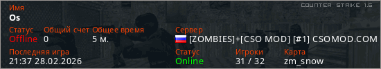 Играет на Counter Strike 1.6 сервере. Страна: РоссияПервый раз замечен 21:34 28.02.2026