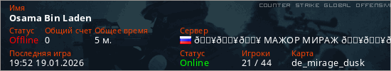 Играет на Counter Strike Global Offensive сервере. Страна: РоссияПервый раз замечен 19:50 19.01.2026