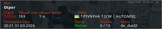 Играет на Counter Strike 1.6 сервере. Страна: УкраинаПервый раз замечен 21:35 25.03.2026