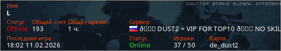 Играет на Counter Strike Global Offensive сервере. Страна: РоссияПервый раз замечен 19:19 20.01.2025