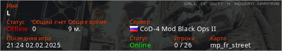 Играет на Call of Duty 4: Modern Warfare сервере. Страна: РоссияПервый раз замечен 21:10 02.02.2025