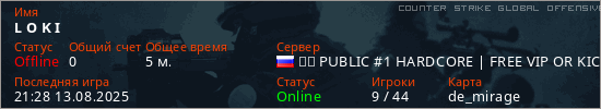 Играет на Counter Strike Global Offensive сервере. Страна: РоссияПервый раз замечен 20:55 13.08.2025