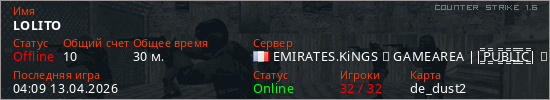 Играет на Counter Strike 1.6 сервере. Страна: ФранцияПервый раз замечен 07:21 22.03.2026