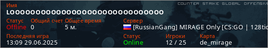 Играет на Counter Strike Global Offensive сервере. Страна: РоссияПервый раз замечен 13:01 29.06.2025