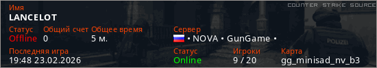 Играет на Counter Strike Source сервере. Страна: РоссияПервый раз замечен 19:42 23.02.2026
