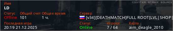 Играет на Counter Strike Source сервере. Страна: РоссияПервый раз замечен 16:05 13.12.2024