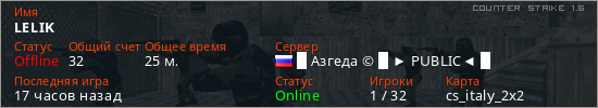 Играет на Counter Strike 1.6 сервере. Страна: РоссияПервый раз замечен 23:41 15.03.2026