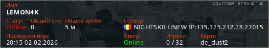 Последний раз был в сети 20:15 02.02.2026 Игрок с таким ником замечен на 2 серверах
