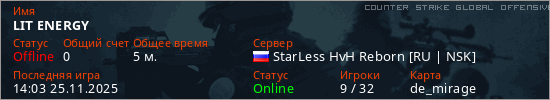 Играет на Counter Strike Global Offensive сервере. Страна: РоссияПервый раз замечен 14:01 25.11.2025