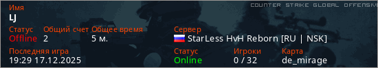 Играет на Counter Strike Global Offensive сервере. Страна: РоссияПервый раз замечен 19:23 17.12.2025