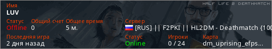 Играет на Half Life 2 DeathMatch сервере. Страна: РоссияПервый раз замечен 20:20 22.02.2026
