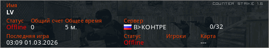 Играет на Counter Strike 1.6 сервере. Страна: РоссияПервый раз замечен 03:07 01.03.2026