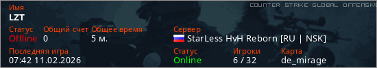 Играет на Counter Strike Global Offensive сервере. Страна: РоссияПервый раз замечен 07:37 11.02.2026