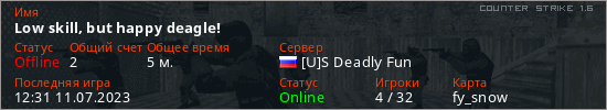 Играет на Counter Strike 1.6 сервере. Страна: РоссияПервый раз замечен 12:29 11.07.2023