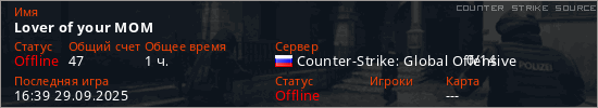 Играет на Counter Strike Source сервере. Страна: РоссияПервый раз замечен 11:44 21.09.2025