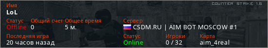 Играет на Counter Strike 1.6 сервере. Страна: РоссияПервый раз замечен 23:28 10.02.2026