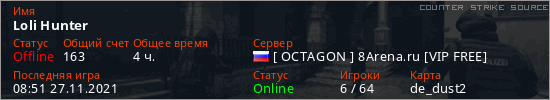 Играет на Counter Strike Source сервере. Страна: РоссияПервый раз замечен 11:26 22.11.2021