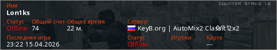 Играет на Counter Strike 1.6 сервере. Страна: РоссияПервый раз замечен 22:49 13.04.2026