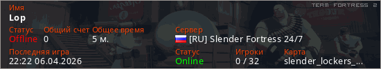 Играет на Team Fortress 2 сервере. Страна: РоссияПервый раз замечен 22:20 06.04.2026