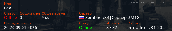 Играет на Counter Strike Source сервере. Страна: РоссияПервый раз замечен 09:36 09.01.2026